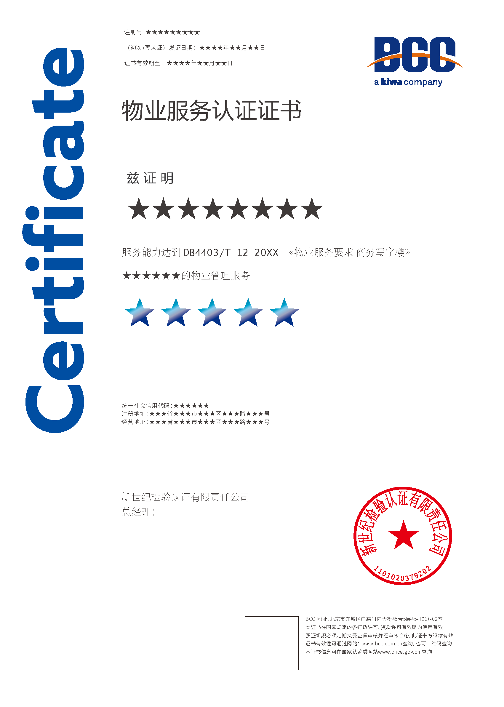 依據(jù)GB/T20647.9 《社區(qū)服務指南 第9部份:物業(yè)服務》標準要求,對企業(yè)進行物業(yè)體系審查。認證審查的結(jié)果是證明企業(yè)按照標準實施了物業(yè)服務,并達到了某一個高度(星級)。它是評分制的認證標準,按評價的分值來衡量服務能力的高低。