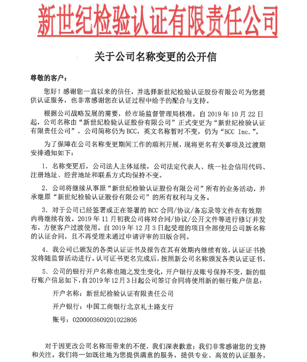 根據公司戰(zhàn)略發(fā)展的需要,經市場監(jiān)督管理局核準,自2019年10月22日起,公司名稱由“新世紀檢驗認證股份有限公司”正式變更為“新世紀檢驗認證有限責任公司”,公司簡稱仍為BCC,英文名稱暫時不變,仍為“BCC Inc.”。