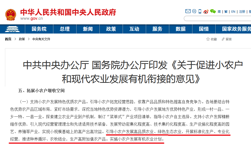 其中意見描述:“引導小農(nóng)戶發(fā)展高品質(zhì)農(nóng)業(yè)、綠色生態(tài)農(nóng)業(yè),開展標準化生產(chǎn)、專業(yè)化經(jīng)營,推進種養(yǎng)循環(huán)、農(nóng)牧結(jié)合,生產(chǎn)高附加值農(nóng)產(chǎn)品。實施小農(nóng)戶發(fā)展有機農(nóng)業(yè)計劃。”