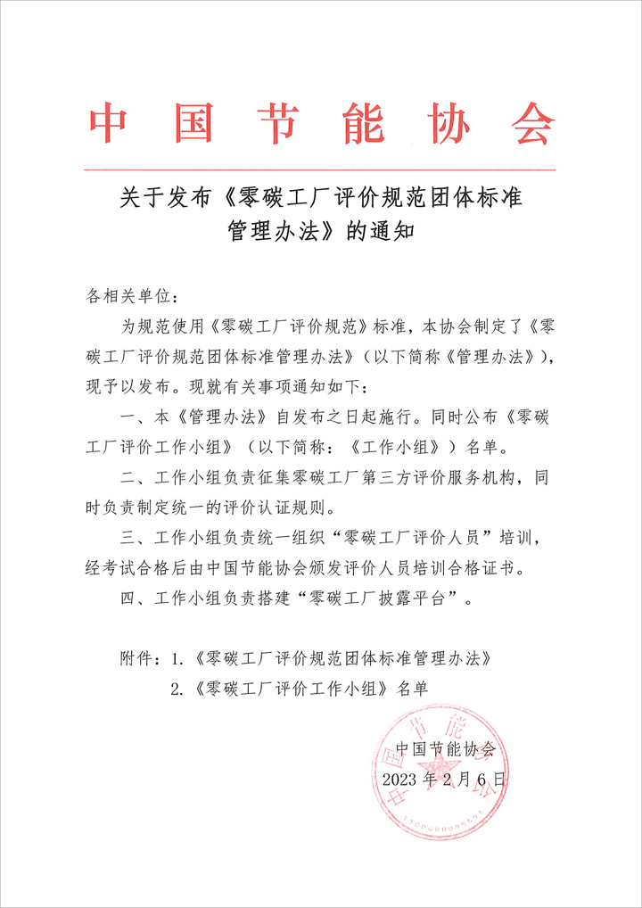 關(guān)于發(fā)布《零碳工廠評價規(guī)范團體標準管理辦法》的通知
