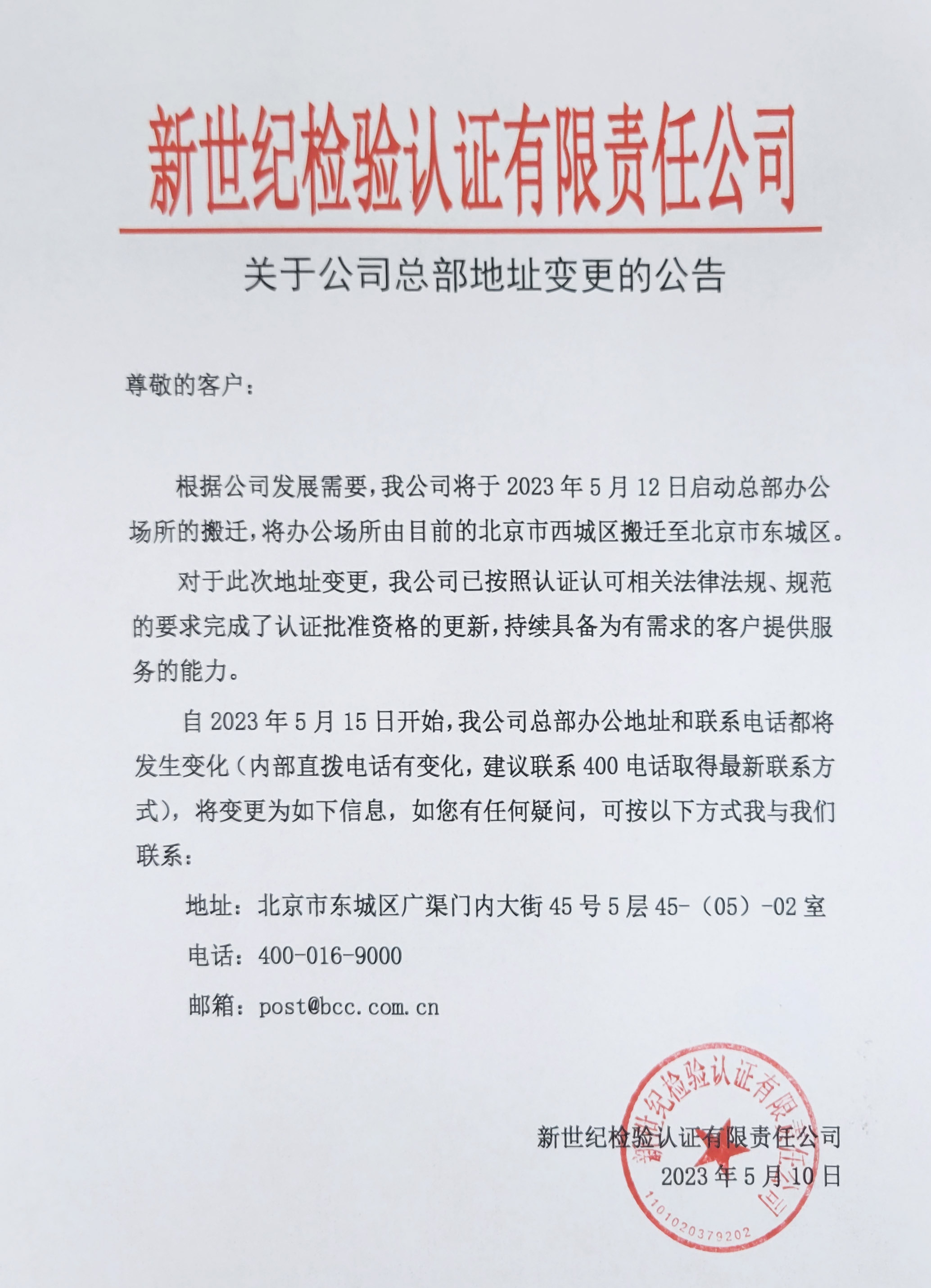 自2023年5月15日開始,我公司總部辦公地址和聯(lián)系電話部將發(fā)生變化(內(nèi)部直撥電話有變化,建議聯(lián)系400電話取得最新聯(lián)系方式),將變更為如下信息,如您有任何疑問(wèn),可按以下方式我與我們聯(lián)系: