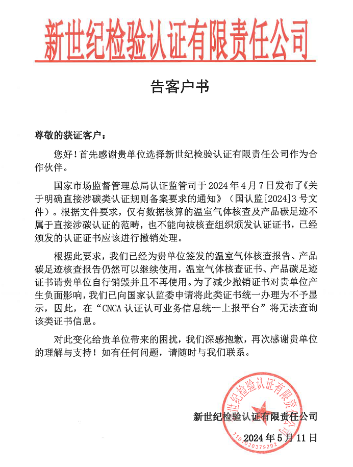 根據(jù)此要求,我們已經(jīng)為貴單位簽發(fā)的溫室氣體核查報告、產(chǎn)品碳足跡核查報告仍然可以繼續(xù)使用,溫室氣體核查證書、產(chǎn)品碳足跡 證書請貴單位自行銷毀并且不再使用。為了減少撤銷證書對貴單位產(chǎn) 生負面影響,我們已向國家認監(jiān)委申請將此類證書統(tǒng)一辦理為不予顯示,因此,在 “ CNCA 認證認可業(yè)務(wù)信息統(tǒng)一上報平臺 “ 將無法查詢該類證書信息。