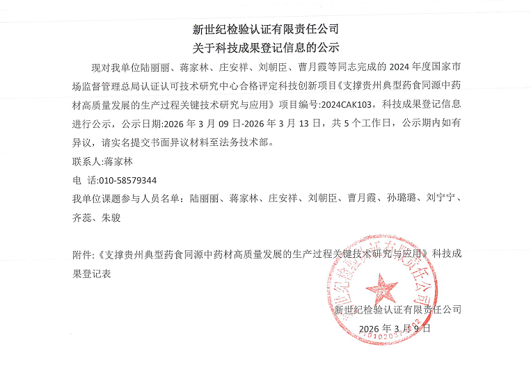 現(xiàn)對我單位陸麗麗、蔣家林、莊安祥、劉朝臣、曹月霞等同志完成的2024年度國家市場監(jiān)督管理總局認證認可技術研究中心合格評定科技創(chuàng)新項目《支撐貴州典型藥食同源中藥材高質(zhì)量發(fā)展的生產(chǎn)過程關鍵技術研究與應用》項目編號:2024CAK103,科技成果登記信息進行公示,公示日期:2026年3月09日-2026年3月13日,共5個工作日,公示期內(nèi)如有異議,請實名提交書面異議材料至法務技術部。